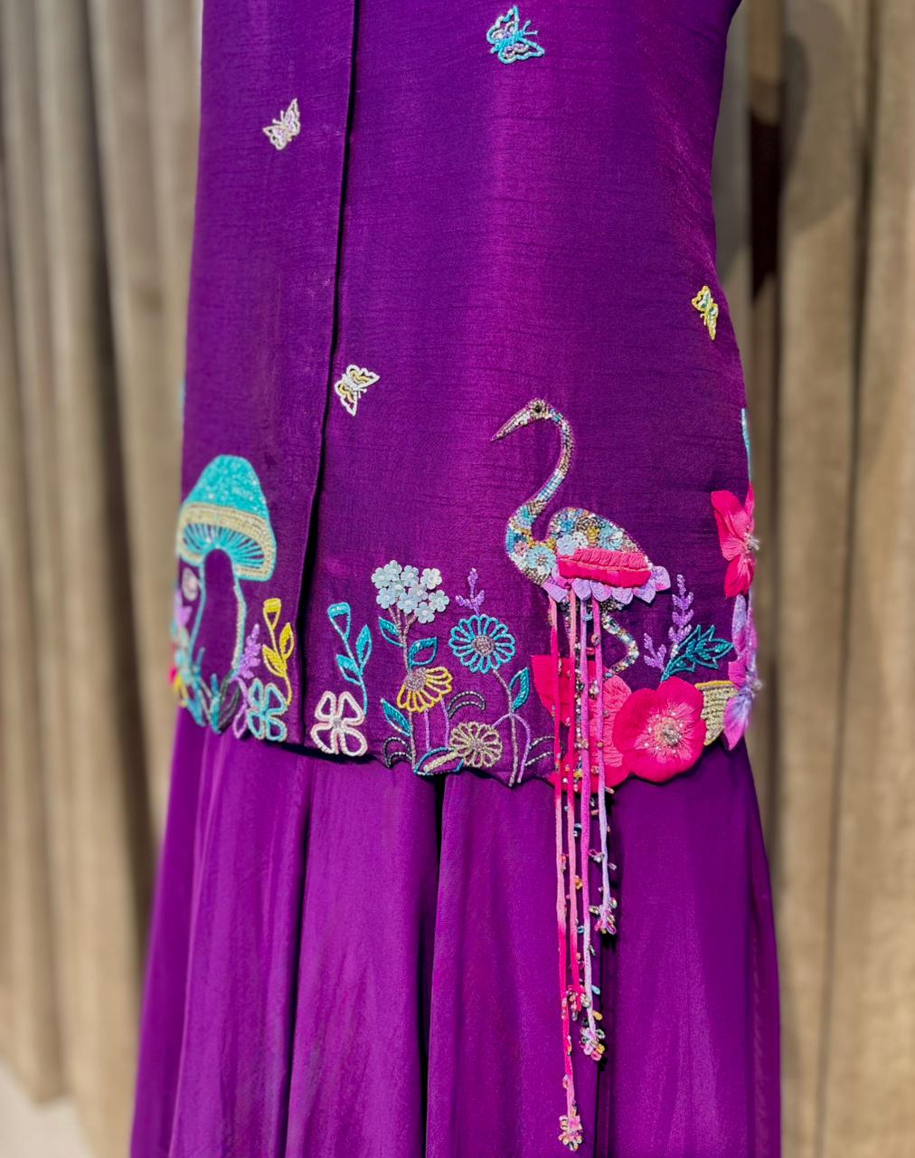 Crafted in rich silk and organza, the sleeveless Jacket top is adorned with over 1000 hand-done embellishments — forming delicate flamingos, florals, and mushrooms that add a touch of whimsy. This ensemble captures the perfect balance of bold color, detailed artistry, and graceful charm.