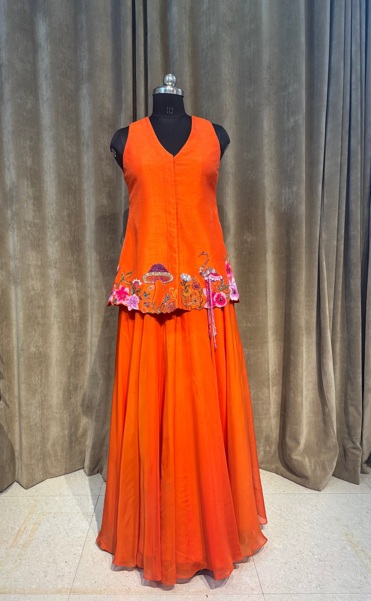 A burst of sunshine reimagined in silk and organza — the Tangerine Flamingo Co-ord blends playful energy with poised craftsmanship.