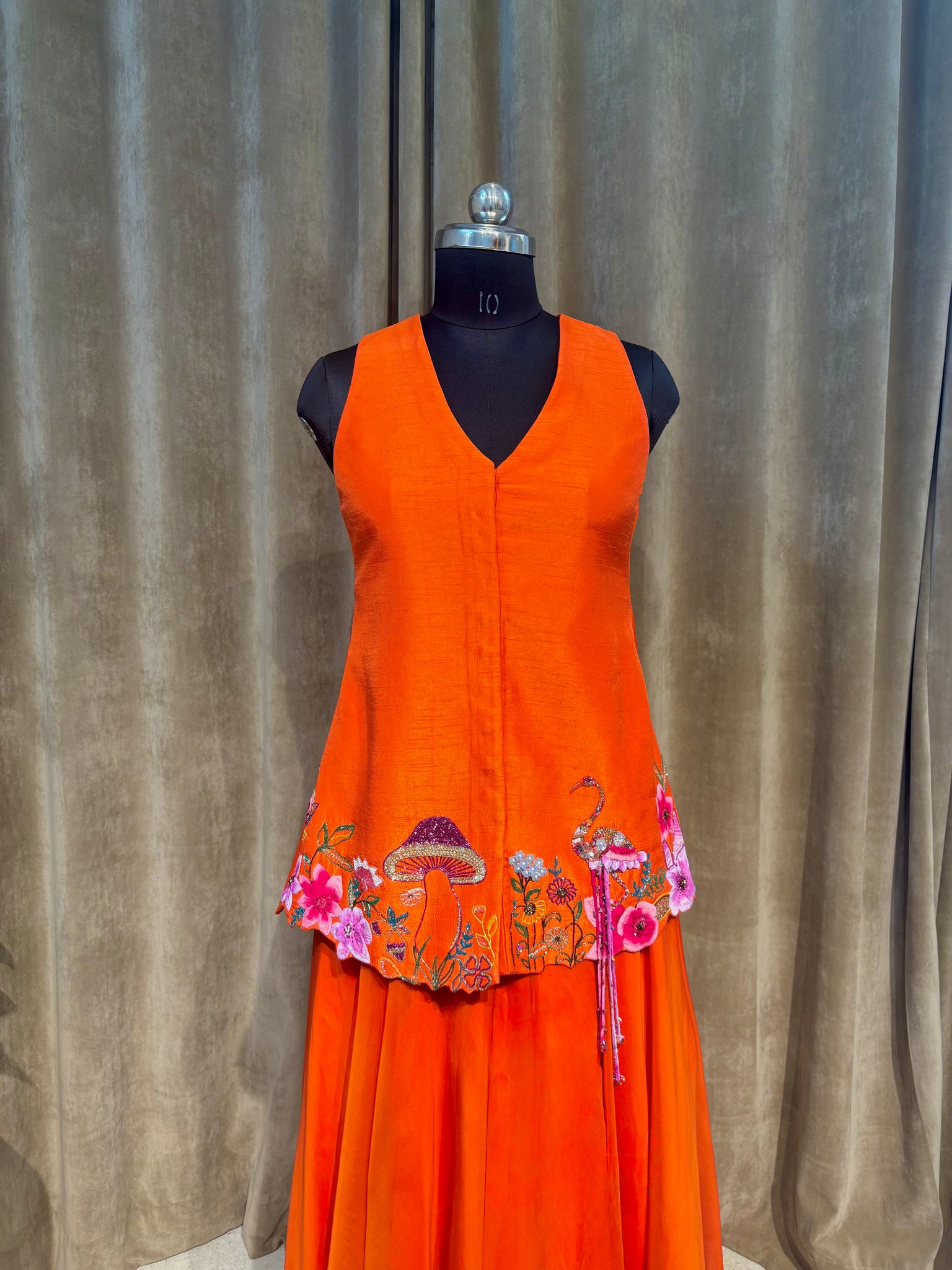 The sleeveless jacket top features intricate hand embroidery with over 1000 embellishments, forming whimsical flamingos, florals, and mushrooms along the hemline made for those who love to bloom boldly and beautifully.